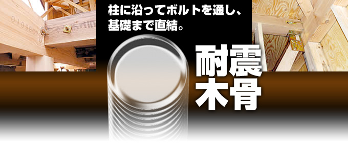 木造で最大の安心を探して、そして辿り着いたものが、柱すべてに通しボルトを沿わせる工法でした。基礎から土台そして柱の横に、長く太い3mの通しボルト (Φ16mm)を貫通して、梁の上で上の柱に入る通しボルトと接合。基礎から土台・梁・柱・桁と全てを通しボルトで連結します。さらにボルトの先端には接合部の木痩せによる収縮の隙間を地震等の揺れにより自動で締めることが可能なウルトラナッターを採用しました。 さらに2種類の筋交いと多くの金物を用い「壁倍率8.0倍」という、木造住宅では日本最大の強度を実現しました。これは木造住宅でありながら鉄筋コンクリート造り同等以上の頑丈さを示します。