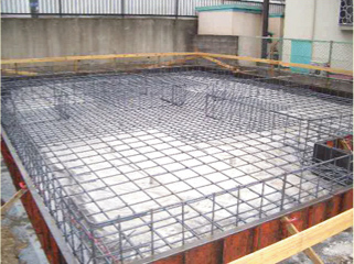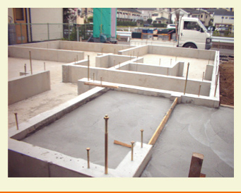 | 更に安心。基礎は鉄筋コンクリートのスラブ一体基礎(ベタ基礎)工事が行われ、上棟しました。 |