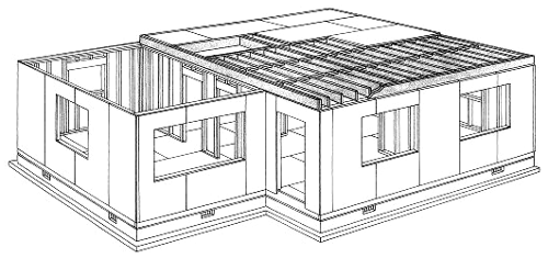 壁の組立は、プラットフォームの上で平らに倒した状態でパネルとして組立られ、さらに外壁に面する
