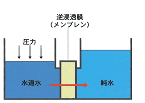 逆浸透膜は、選択透過性という特性を持っており、様々な物質が溶け込んでいる水溶液(例えば水道水)に圧力を加えると、水の分子のみを透過させる事ができます。