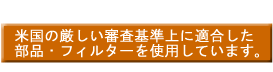 NSFインターナショナル、FDA(アメリカ食品医薬局)、ISO(国際標準化機構)、の厳しい審査並びに基準に適合した信頼ある部品やフィルターを使用しています。